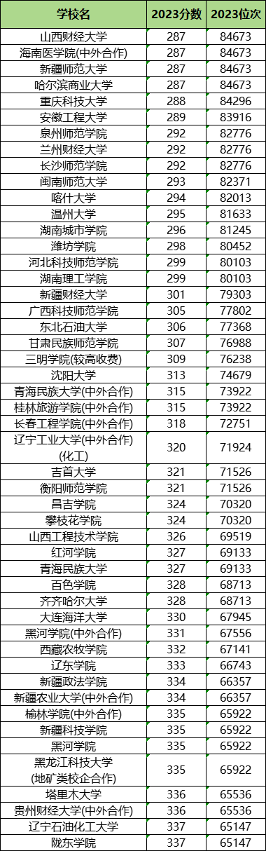 最好考、收分最低的公办二本大学有山西财经大学、海南医学院(中外合作)、新疆师范大学、哈尔滨商业大学、重庆科技大学等,这些学校中2023理科最低投档分为287分,刚好压黑龙江理科二本线录取,考生可捡漏。