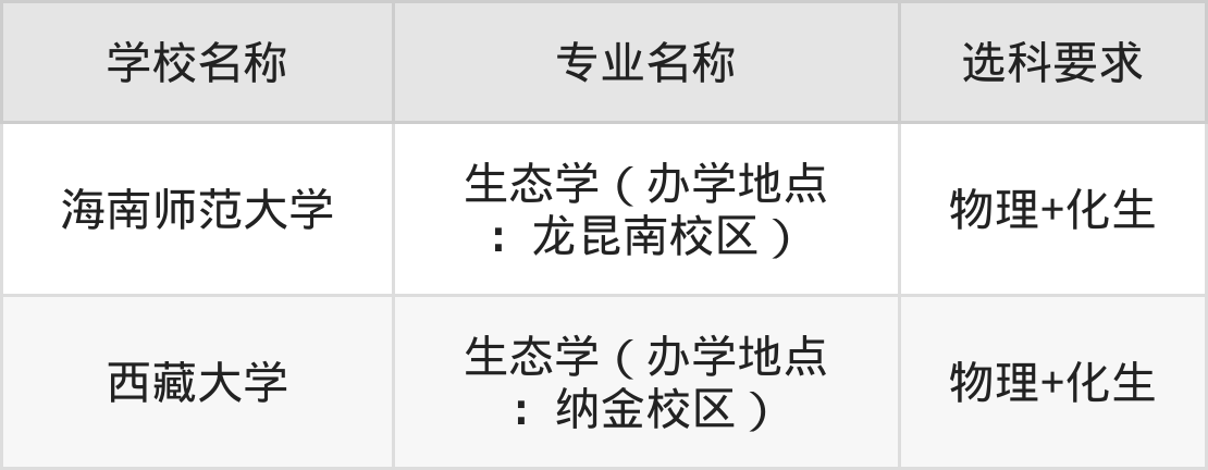 | 海南大学 | 生态学(办学地点 :海甸校区) | 物理+化 |