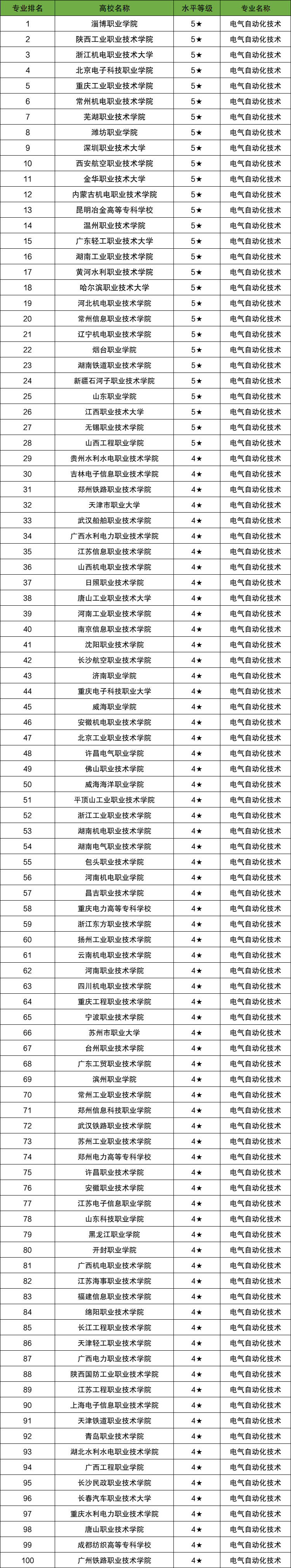 电气自动化技术最好的专科院校是淄博职业学院,排名前五的还有陕西工业职业技术学院、浙江机电职业技术大学、北京电子科技职业学院、重庆工业职业技术学院。
