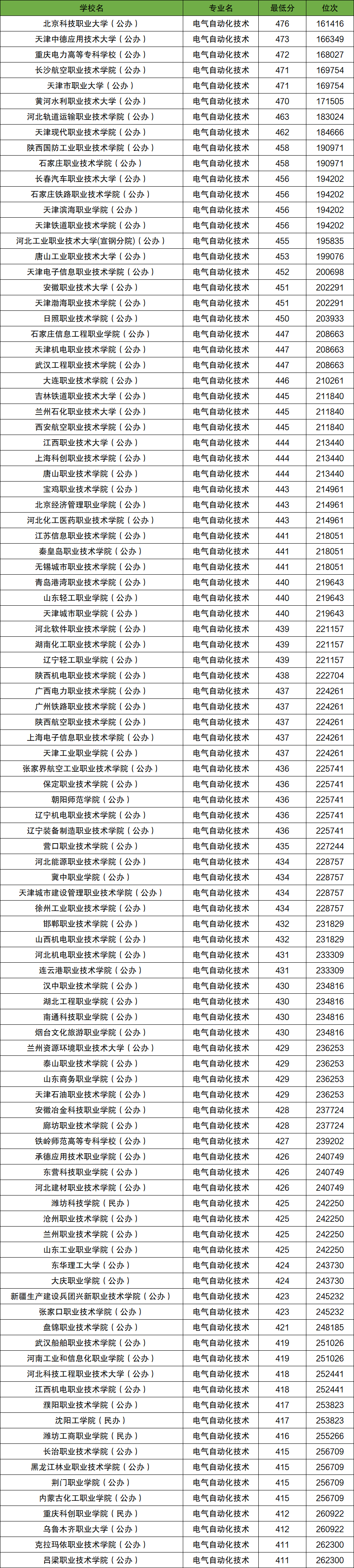 450分左右的电气自动化技术大学:安徽职业技术大学451分、天津渤海职业技术学院451分、石家庄铁路职业技术学院450分、石家庄信息工程职业学院447分。