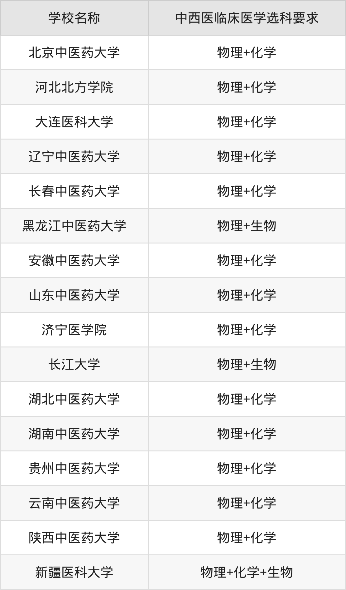 以辽宁高考最新招生计划为例进行统计,在不可报的学校中,有18所本科大学的中西医临床医学专业招生时,要求考生必选“物理+化学”,有3所本科大学的中西医临床医学专业招生时,要求考生必选“物理+生物”,有2所本科大学的中西医临床医学专业招生时,要求考生必选“物理+化学+生物”。