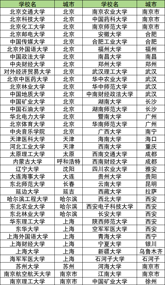 1.北京(17所):北京交通大学、北京科技大学、北京化工大学、北京邮电大学、中国传媒大学、北京外国语大学、中国政法大学、中央财经大学、对外经济贸易大学、北京中医药大学、北京林业大学、中国地质大学(北京)、中国矿业大学(北京)、中国石油大学(北京)、华北电力大学(北京)、北京体育大学、中央音乐学院;