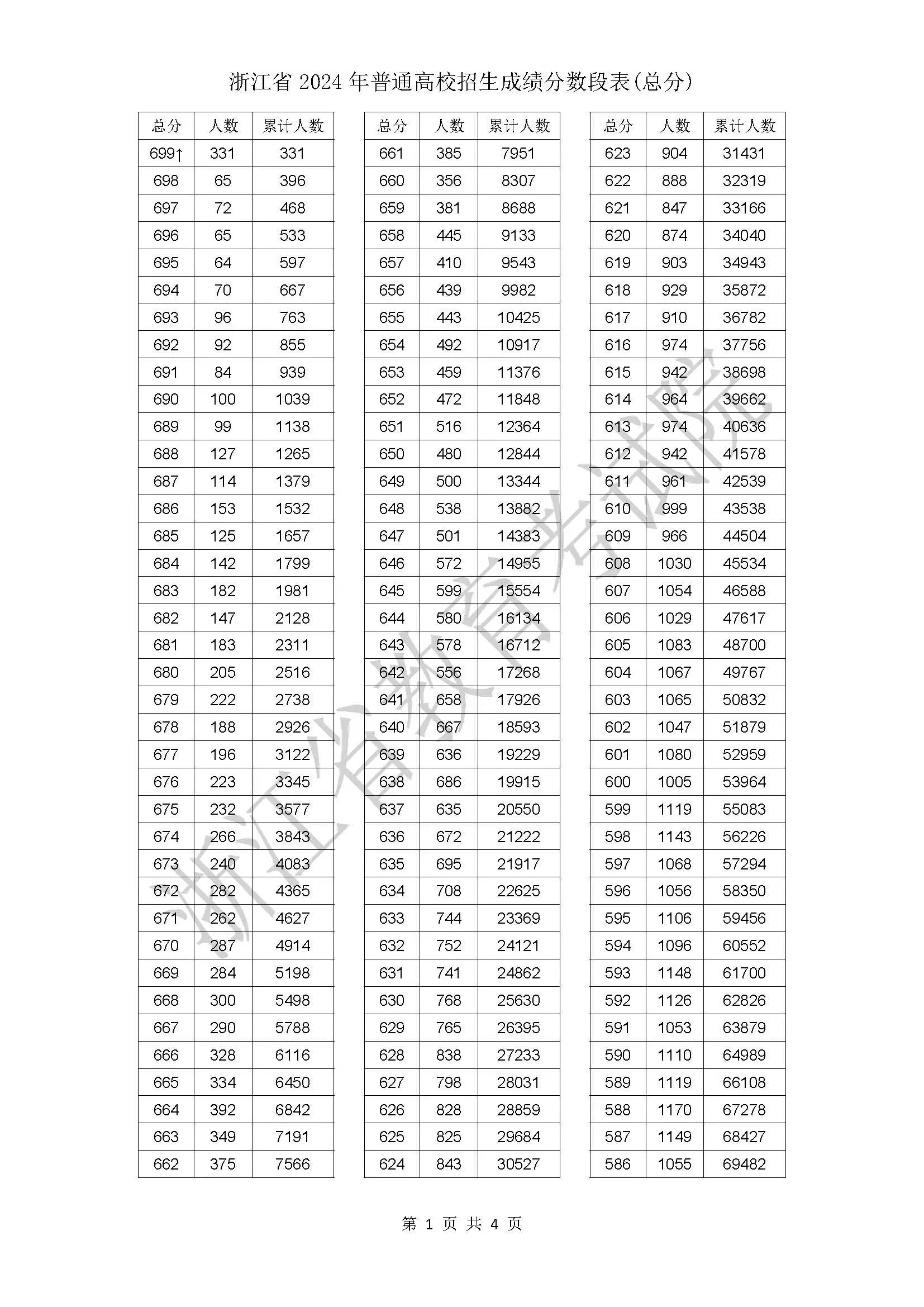 浙江考生699分以上最低位次311;698分最低位次396;697分最低位次468;696分最低位次533;695分最低位次597;694分最低位次667。