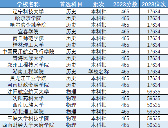 2023年在辽宁以465分录取的大学有18所,历史组招生的院校多于物理组,在历史组招生的院校有12所,物理组招生的有6所。历史组较好的大学有中国民用航空局直属的部属院校中国民用航空飞行学院,以及拥有保研资格的辽宁科技大学和桂林理工大学等院校。物理组较好的大学有国家民委直属的西南民族大学,以及学科突出的沈阳航空航天大学和沈阳药科大学。