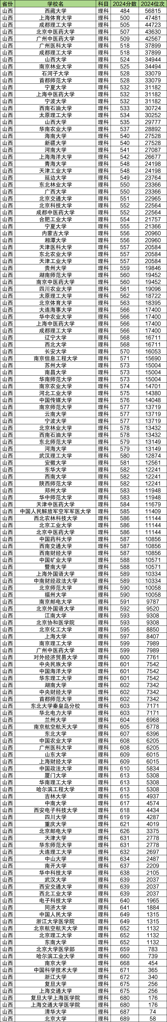 2024年在山西理科双一流大学中,北京大学投档分数最高,该校最低收分689分。