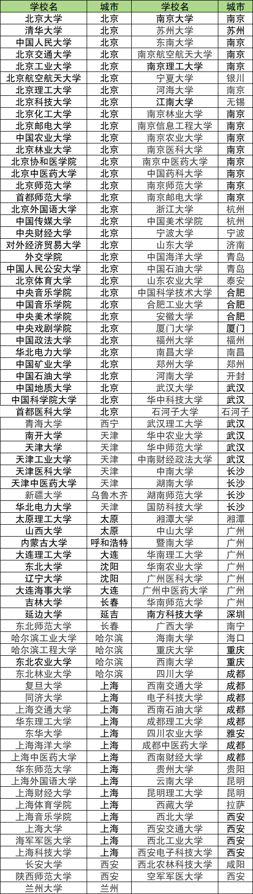 5.上海(15所):复旦大学、同济大学、上海交通大学、华东理工大学、东华大学、上海海洋大学、上海中医药大学、华东师范大学、上海外国语大学、上海财经大学、上海体育学院、上海音乐学院、上海大学、海军军医大学、上海科技大学。