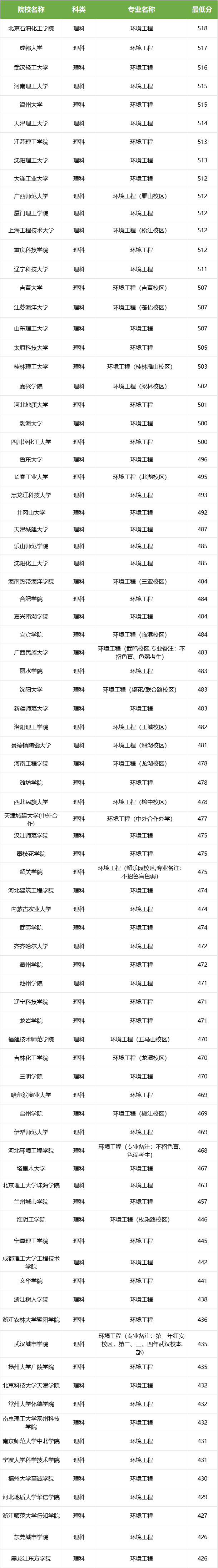 下表为在二本招收环境工程专业的大学,以及最低录取分和排名。其中很多大学在软科排名中没有环境工程专业排名,本文会在文末附上全国大学环境工程专业排名。