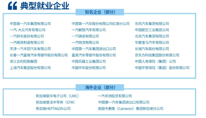 学校与一汽、德国、英国、法国等八百多家企业开展定制培养,每年有75%以上毕业生就职于省内汽车整车、零部件、营销服务类行业,就业率达到95%。