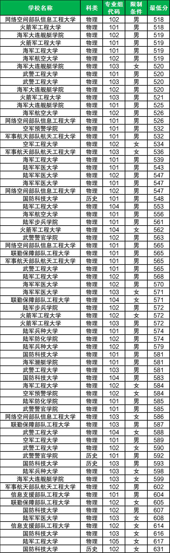在招收女生的军校中,四川历史类仅有1所院校可报考,即国防科技大学。2025年该校102组最低分为631分,超特控线98分。