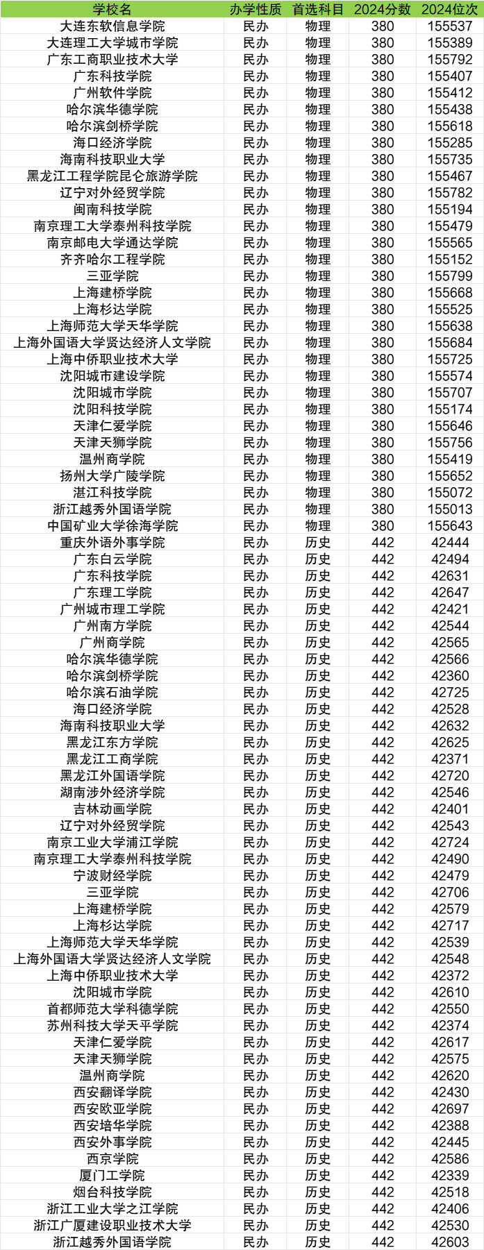 历史类本科线最低的民办大学有浙江越秀外国语学院、厦门工学院、烟台科技学院等,2024年最低分为442分(刚好为本科线分数),对应最低位次为42725名。