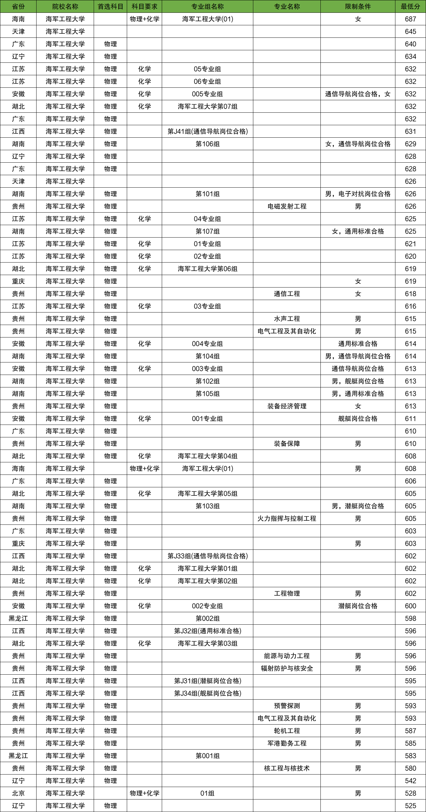 2025年海军工程大学提前批录取分数线是525分到687分,录取最低在辽宁物理类、录取最高在海南(01组)女。