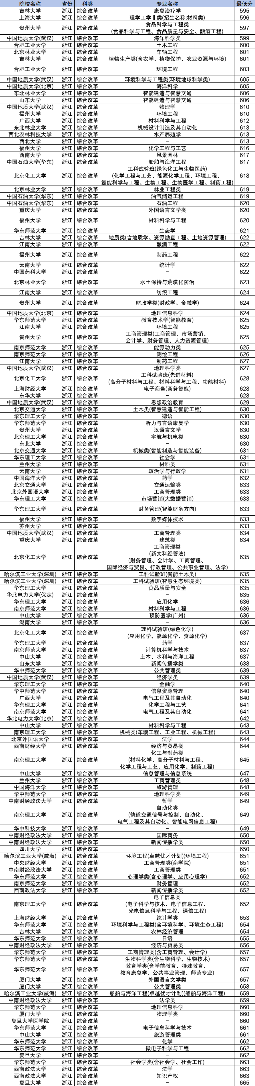 2024年浙江高校专项计划录取分数线595分到665分之间,分数线最低的是吉林大学康复治疗学专业、分数线最高的是复旦大学。