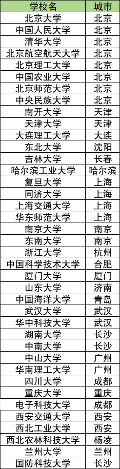 1.北京(8所):北京大学、中国人民大学、清华大学、北京航空航天大学、北京理工大学、中国农业大学、北京师范大学、中央民族大学;