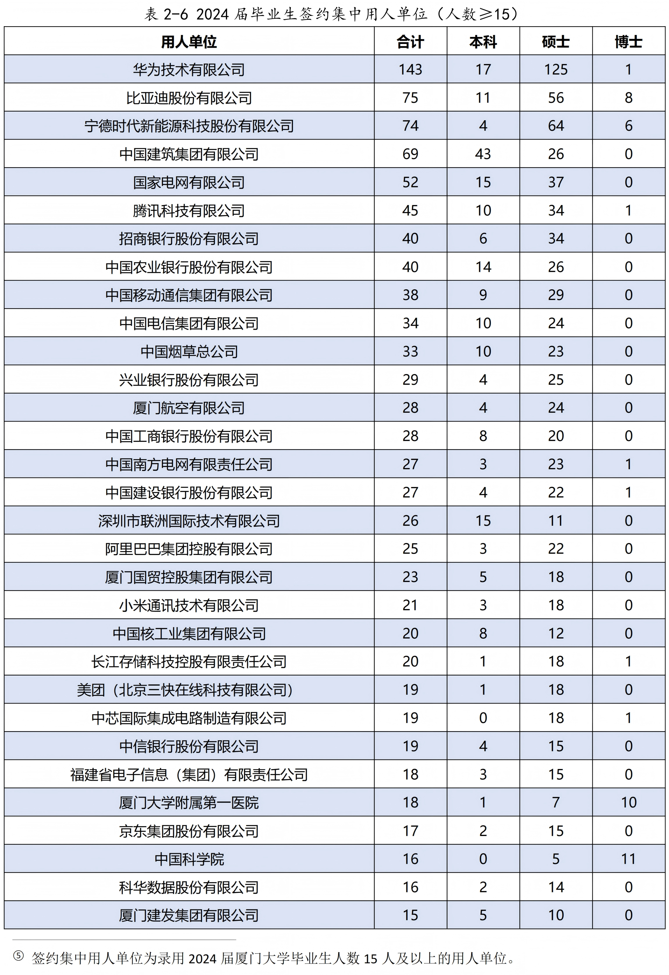 华为(143人)、比亚迪(75人)、宁德时代(74人),都是新能源、科技领域的龙头企业,发展前景好、薪资待遇优。其中华为吸纳了125名硕士、17名本科生,说明厦大的工科人才很受科技巨头认可。