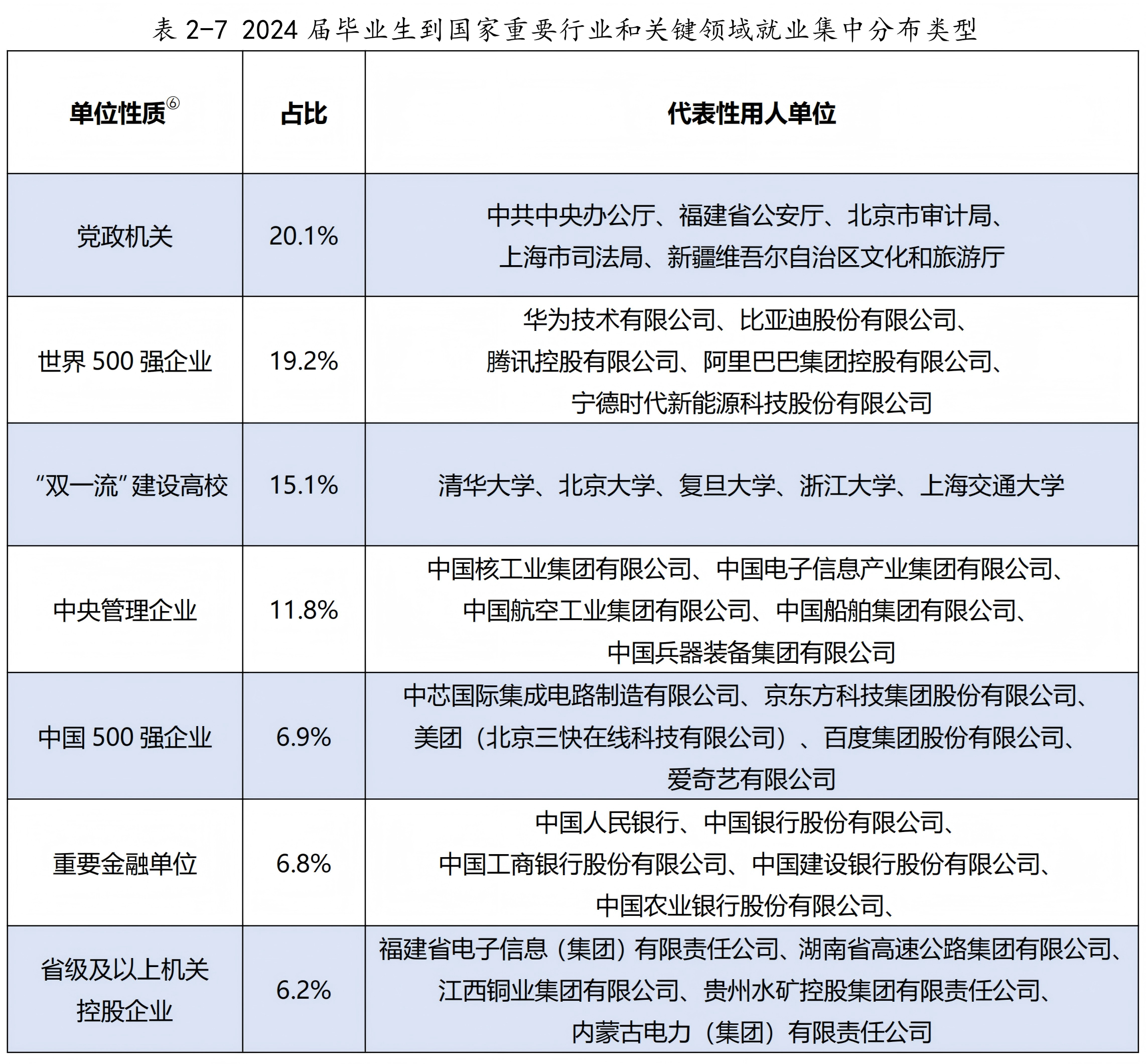 2、具体去向:20.1%进入党政机关(包括中共中央办公厅、北京审计局等),19.2%进入世界500强企业,15.1%进入双一流高校任教,11.8%进入中央管理企业(如中国核工业、中国航空工业等)。