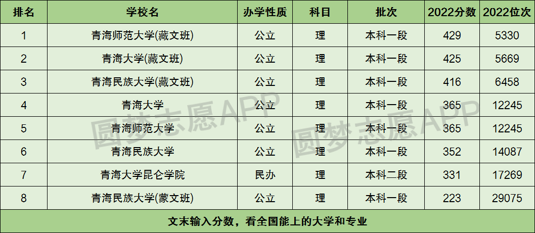 1、收分最高的青海本科大学是青海师范大学(藏文班),2022年最低分为429分,位次排名5330位。