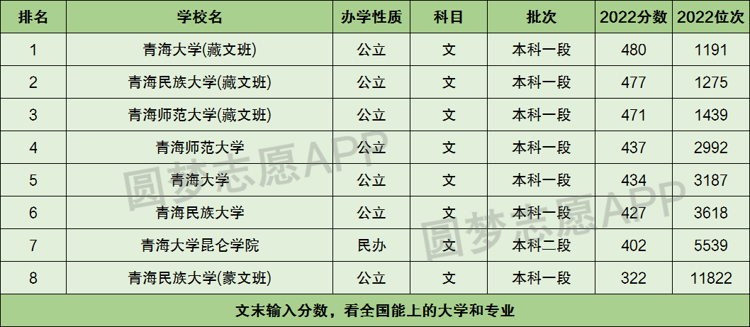 2、收分最低的青海本科大学是青海民族大学(蒙文班),2022年最低分数为322分,位次排名11822位。