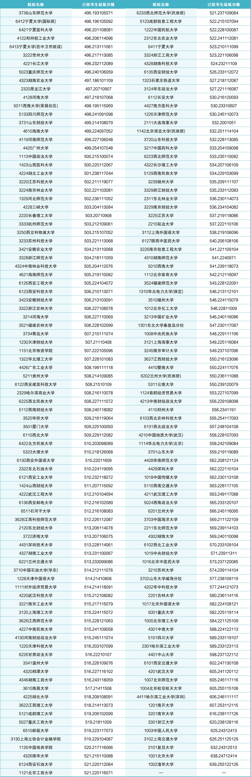 分数较高的院校依旧以985、211院校为主,其中在600分以上的有13所,均为985院校:清华大学最低分为639分,北京大学最低分638分,复旦大学最低分632分,上海交通大学最低分626分等。