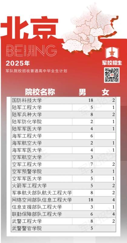 2025年在北京招生的军校共计19所,包括国防科技大学、陆军工程大学、陆军兵种大学、空军工程大学等,完整名单及招生计划见下。