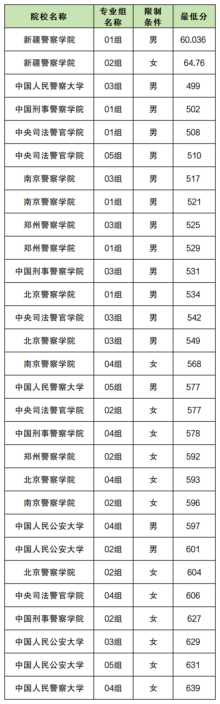 男生:最低60.036分(公务员录用考试总成绩),对应招生学校为新疆警察学院01组。