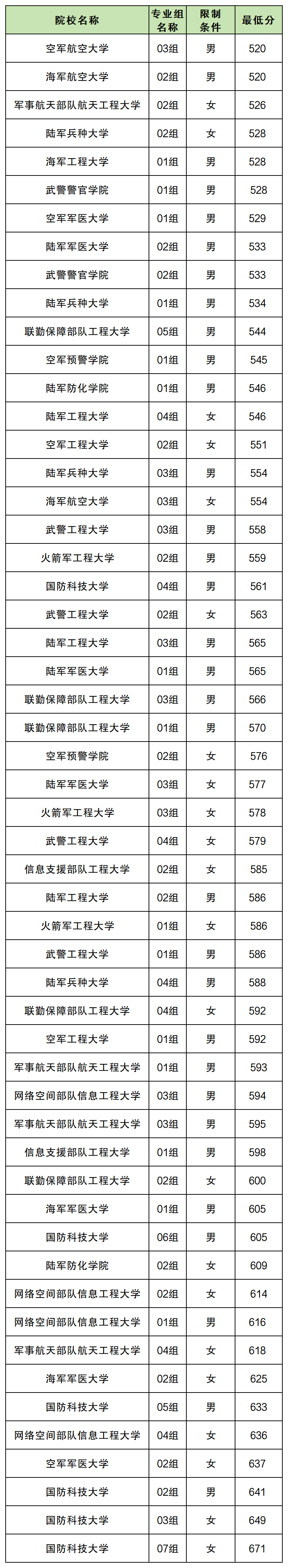 女生:最低526分,对应招生学校为军事航天部队航天工程大学02组。
