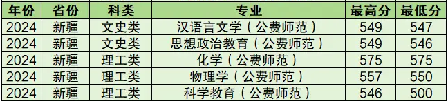 2024年新疆师范大学新疆维吾尔自治区学科教师地方公费师范生计划招生104人,下面是新疆师范大学具体的录取分数情况: