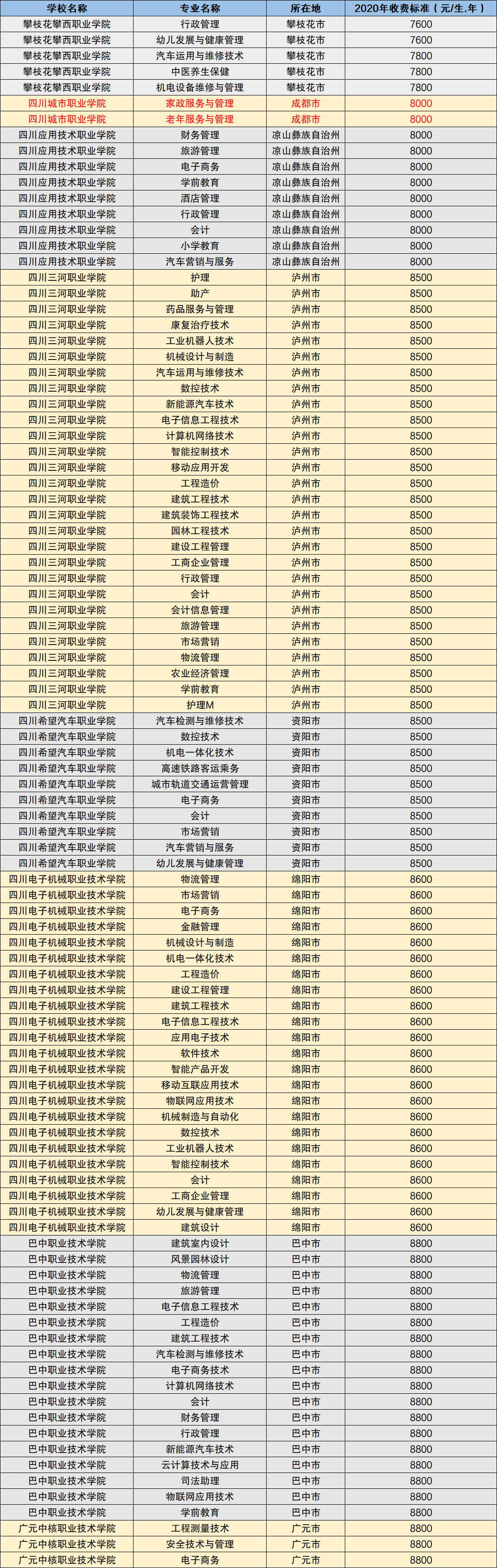 民办专科虽然录取分数线低,但是学费比较贵。截至2020年,四川省共有33所民办专科院校,我们根据2020年四川省最新公布的《民办高校学费收费标准》,为大家整理了其中学费最少的民办专科大学及其最便宜专科专业(学费低于9000元/生.年),供大家在填报志愿的时候参考。