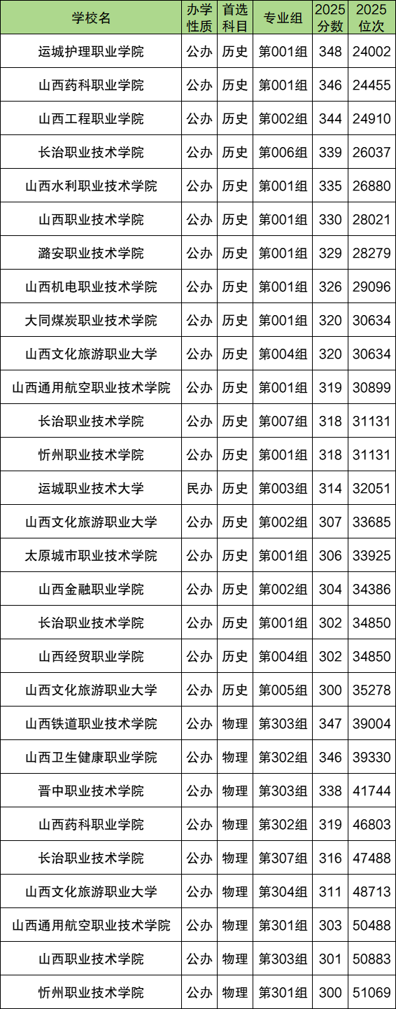 2025年山西专科分数300分到350分对应的大学一共有366所,历史组考生能上的有172所,物理组考生能上的有194所。