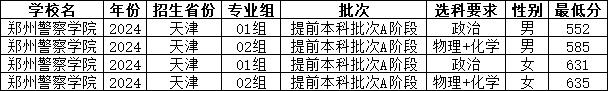 2024年郑州警察学院在天津招警校的分数范围在552分-635分之间,其中男生最低分为552分(01组);女生最低分为631分(01组)。