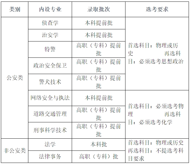 公安本科专业9个(本科提前批):治安学、侦查学、禁毒学、公安管理学、刑事科学技术、交通管理工程、网络安全与执法、安全防范工程和食品药品环境犯罪侦查技术;