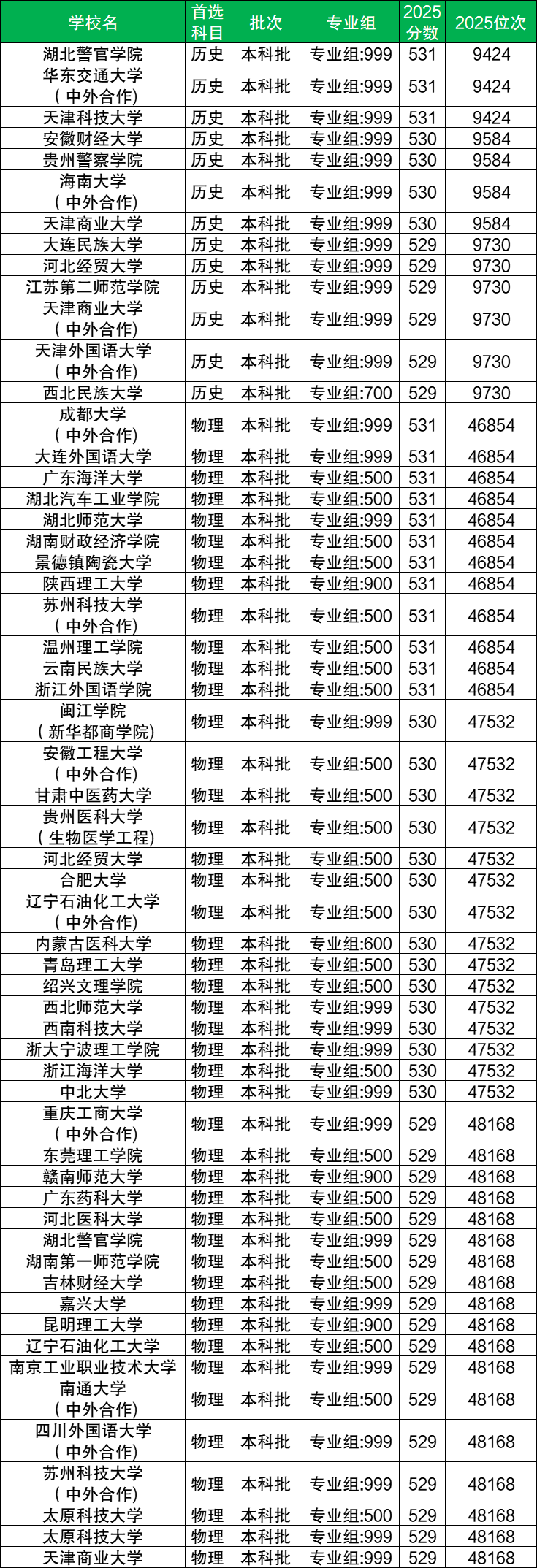 结合广西高考批次线来看,2025年广西高考530分左右的考生,历史组和物理组均可以报考本科批次院校。具体招录数据显示: