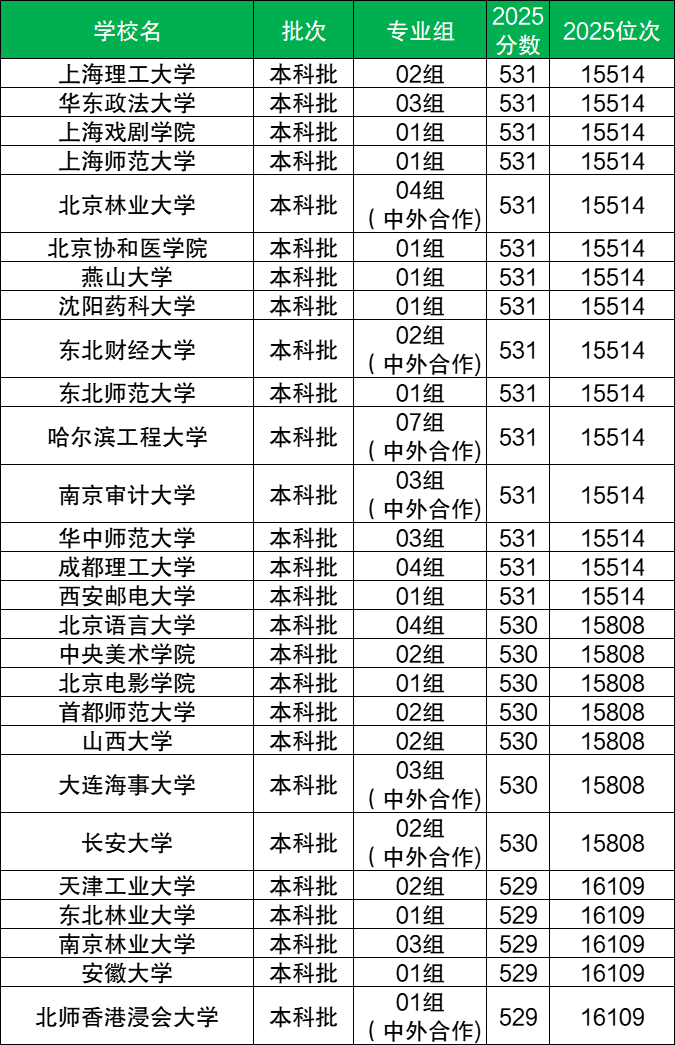 上海新高考属于3+3模式,不分首选科目,2025年最低分数线在529分至531分的大学共有27所,其对应的位次为15514名至16109名。530分对应的大学有:北京语言大学(04组)、中央美术学院(02组)、北京电影学院(01组)等。530分左右对应的大学有:上海理工大学(02组,531分)、华东政法大学(03组,531分)、东北林业大学(01组,529分)、南京林业大学(03组,529分)等。