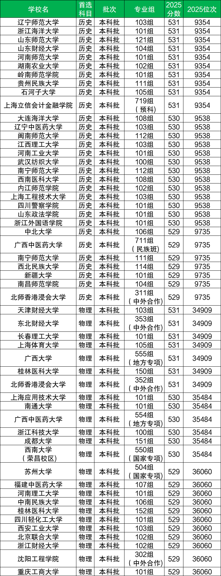 2025年广西历史组530分对应的大连海洋大学(108组)、辽宁中医药大学(103组)、闽南师范大学(112组)等,这些院校主要为省重点、公办本科层次。