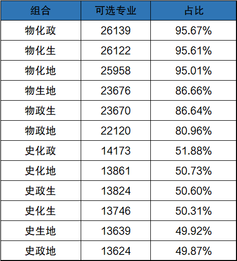 同样,从湖南省公布选考科目汇总表来看,物生地、物生政、物政地组合可选的专业均在两万个以上,占比为80%以上。从传统的理科学科中选择(除首选科目物理外),小编认为生物的难度较小一点,所以物理+生物+地理或者政治是比较好的选择。若对生物无感,那么选择文科中的政治和地理学科作为再选科目也是比较好的。