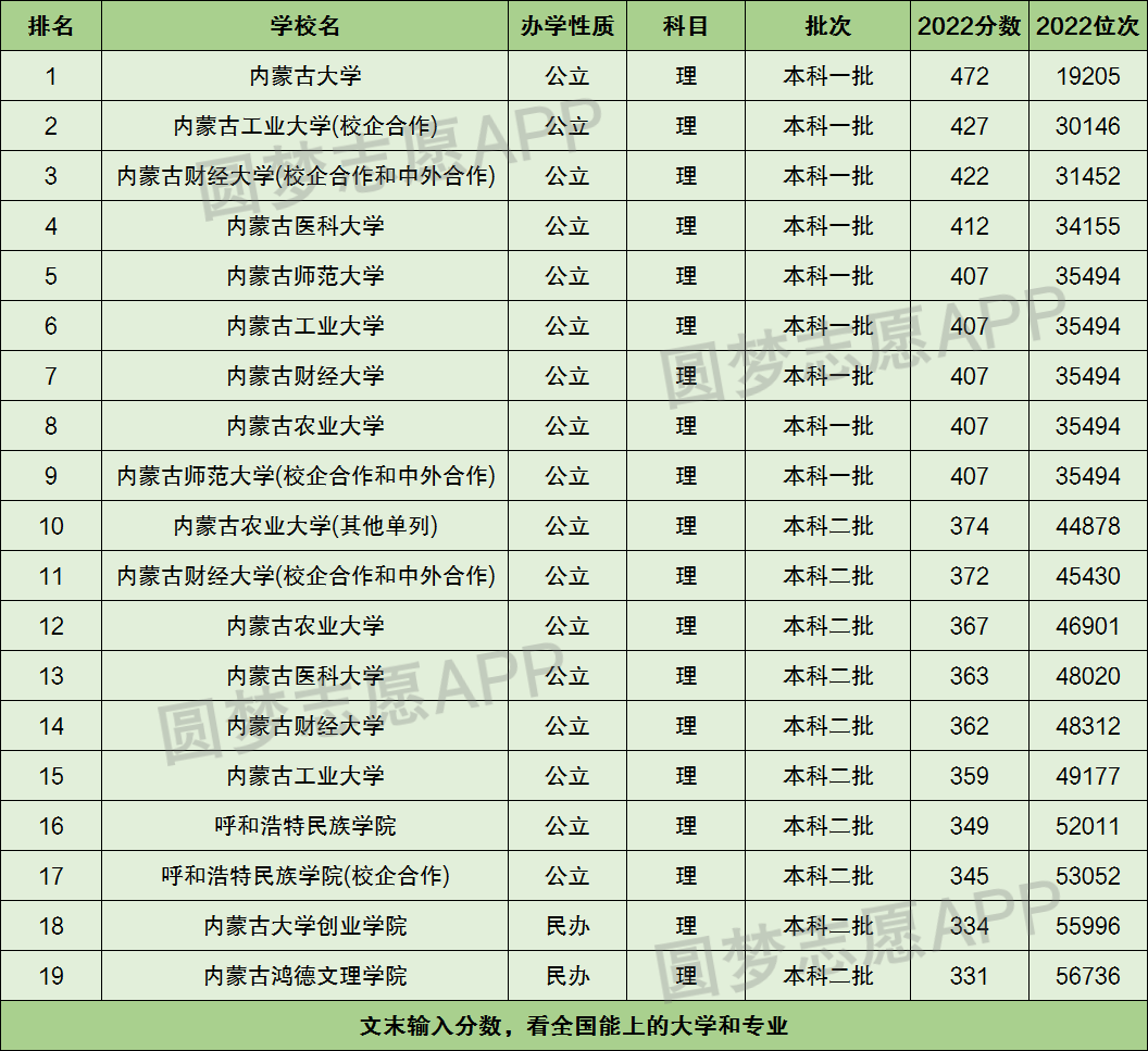 1、收分最高的呼和浩特本科大学是内蒙古大学,2022年最低分为472分,位次排名19205位。
