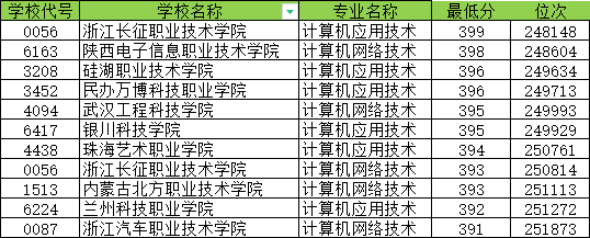 在浙江省,分数线在390-399分之间的计算机专业大学有11所,浙江汽车职业技术学院分数相对较低,为391分,对应全省位次251873,超过浙江省二段线122分。