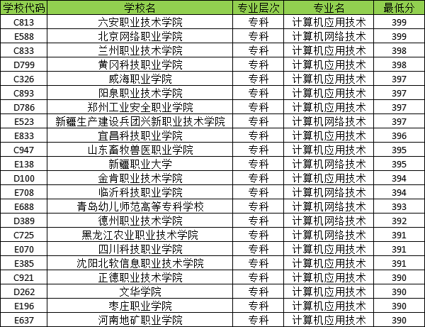 390分能上计算机专业,比如六安职业技术学院、北京网络职业学院、兰州科技职业学院等,本期将介绍高考中哪些大学的计算机专业在390多分。