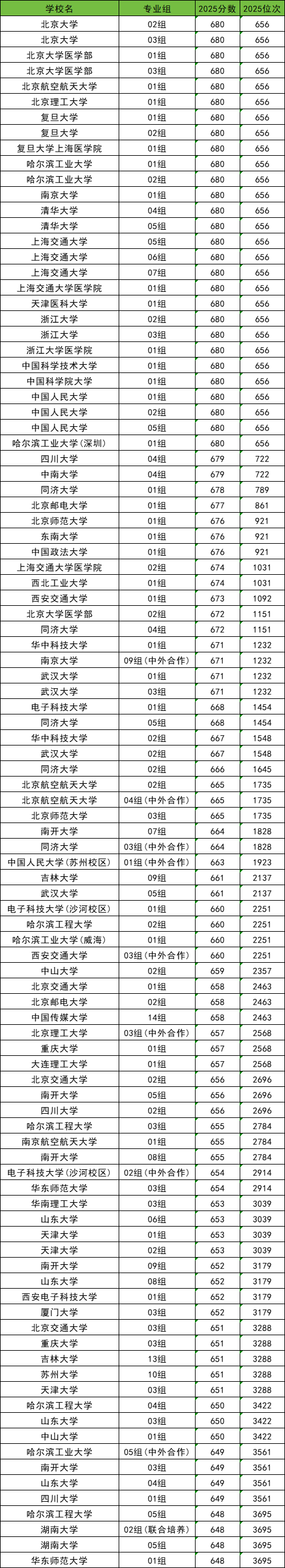 下面是2025全国公办本科大学最低录取分数线部分示例(分数线排名TOP100,需滑动查阅):