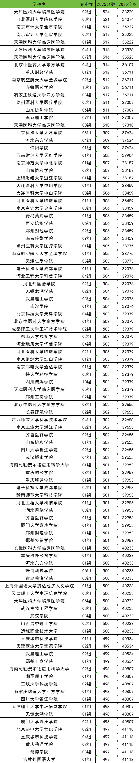 收分门槛较低的公办本科大学有新疆医科大学(477分)、青海民族大学(491分)、湖北文理学院(495分)、新疆农业大学(496分)、昌吉学院(496分),这些学校2025最低分均为500分及以下,超本科线1分到20分录取。