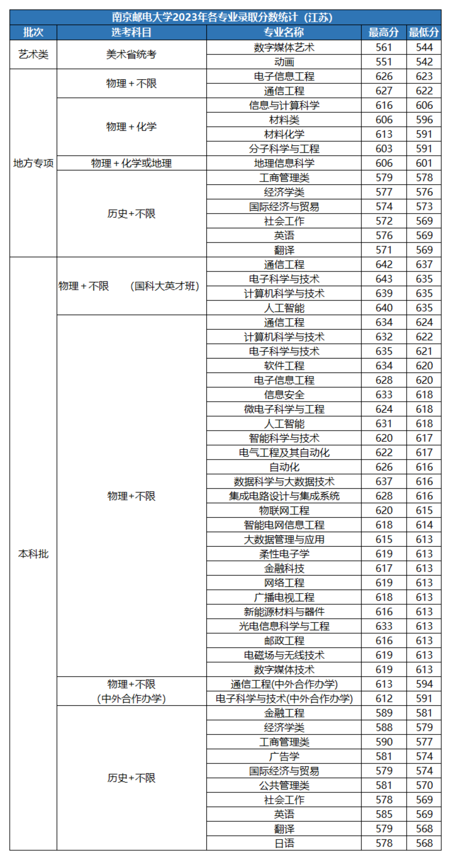 下文为大家整理了2023年南京邮电大学各专业在江苏省招生录取分数线一览表: