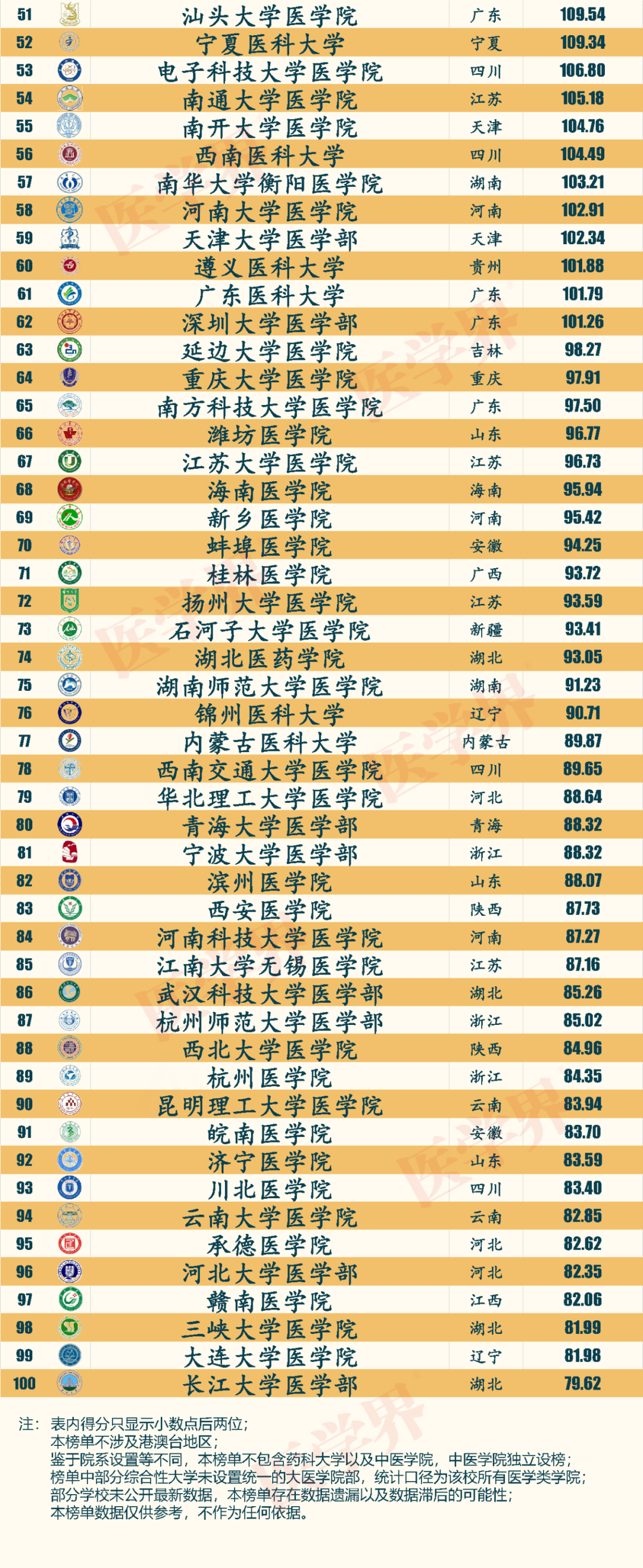 全国医学院校排名100强名单已经公布,北京协和医学院、首都医科大学、南京医科大学均有上榜。中国前十名医科大学有哪些?学医最好去哪个大学等问题一定是大家最想了解的。本文将为大家整理2023年医学院校排行榜,供参考。