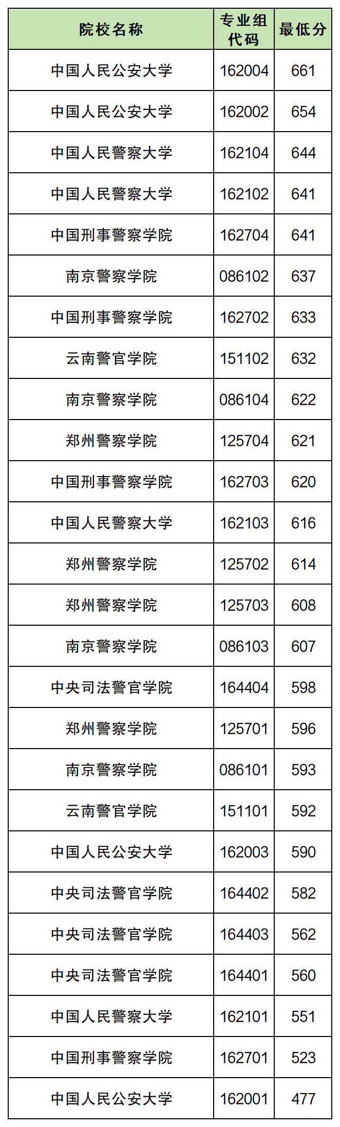 最低分477分,对应中国人民公安大学01组。