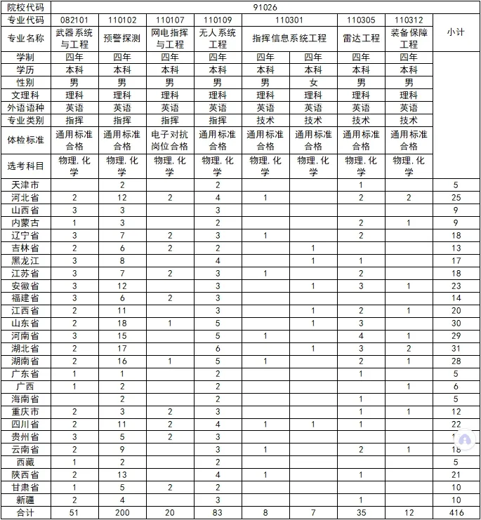 空军预警学院招生简章已公布,2024招生计划416人,其中河北25人,招生专业包括武器系统与工程、预警探测、网电指挥与工程、无人系统工程、指挥信息系统工程、雷达工程、装备保障工程。
