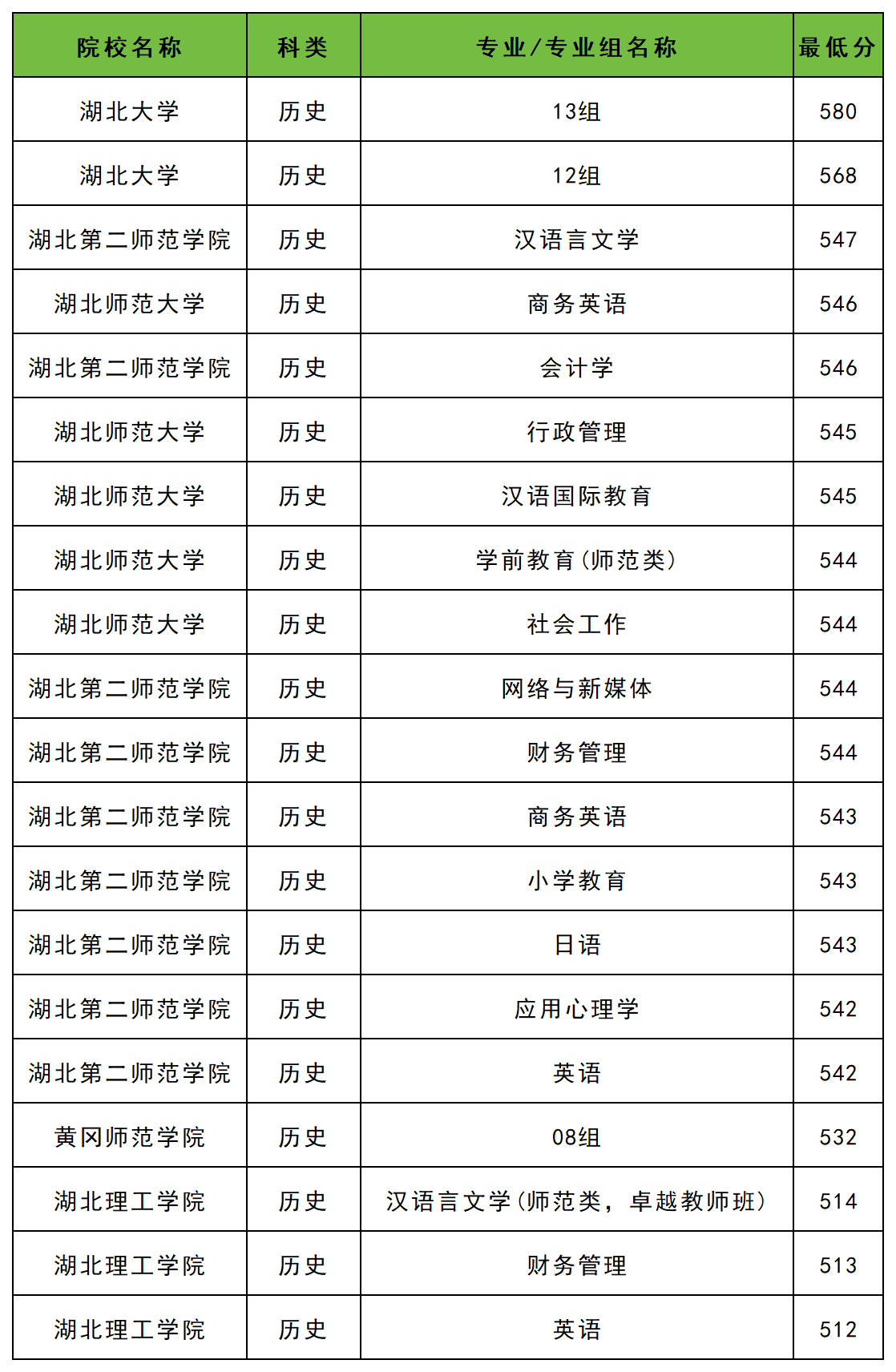 2025年湖北地方专项历史类录取分数线位于512分到580分之间,各学校各专业最低分如下。