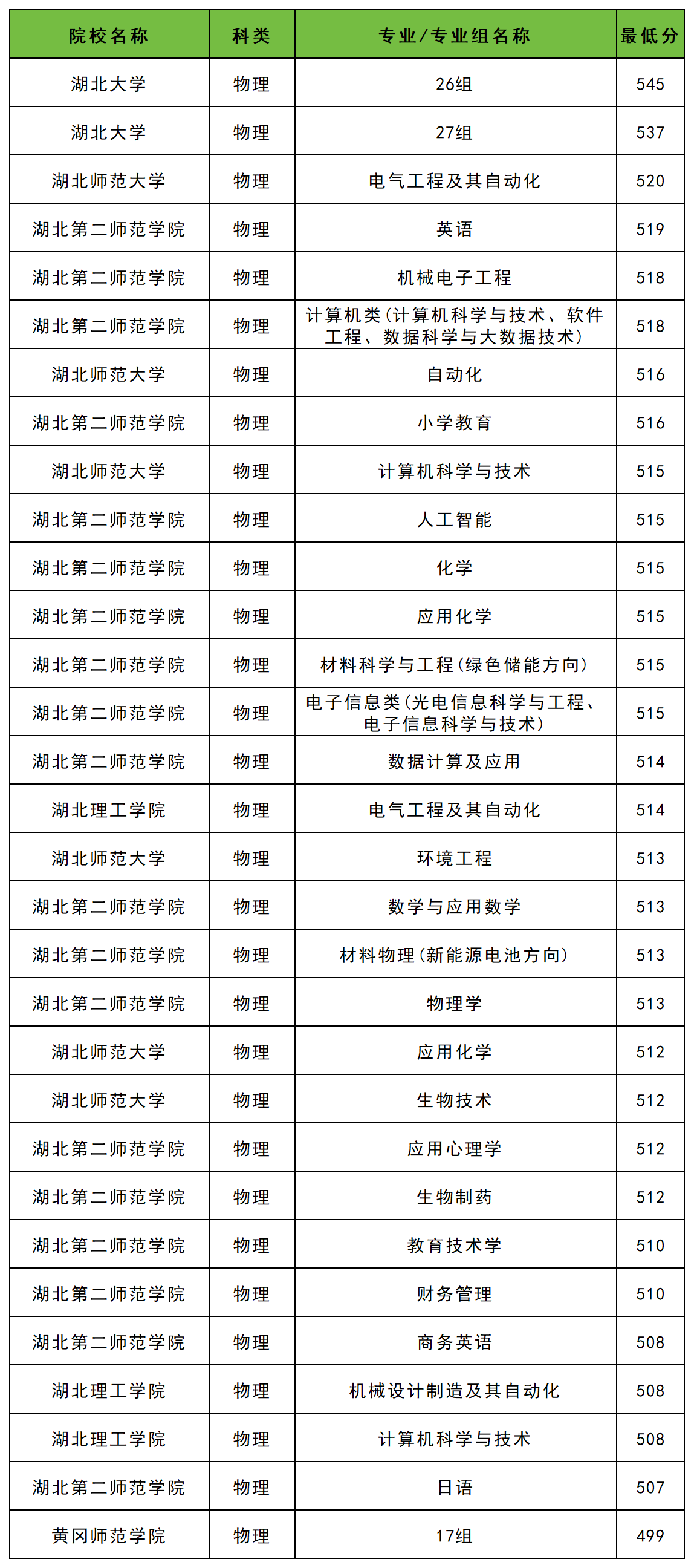 2025年湖北地方专项物理类录取分数线位于499分到545分之间,收分最低的是黄冈师范学院17组,收分最高的是湖北大学26组,各校各专业具体分数线如下。