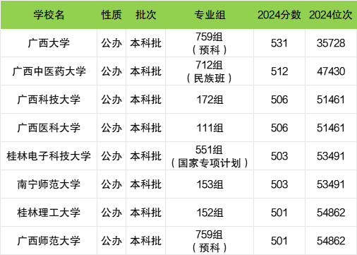 注:2024年广西物理类特招批501分,物理类本科批371分。