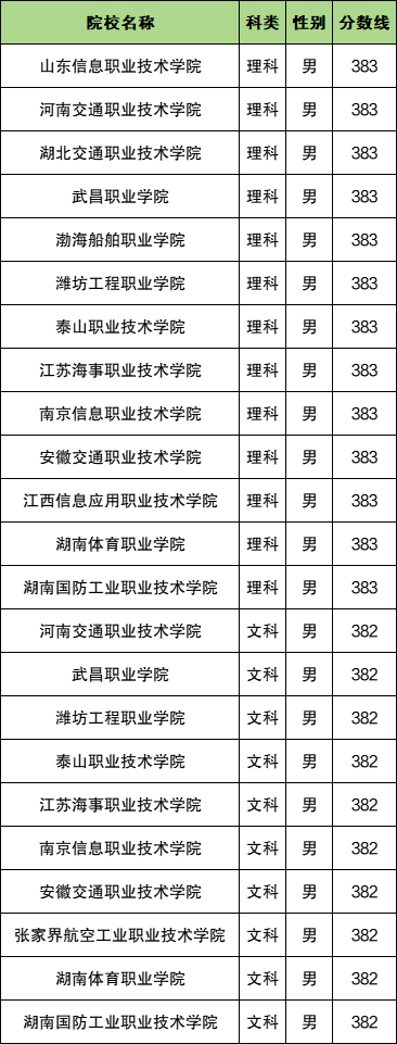 文科分数最低的定向士官有河南交通职业技术学院、武昌职业学院、潍坊工程职业学院等,2024年最低分为382分。