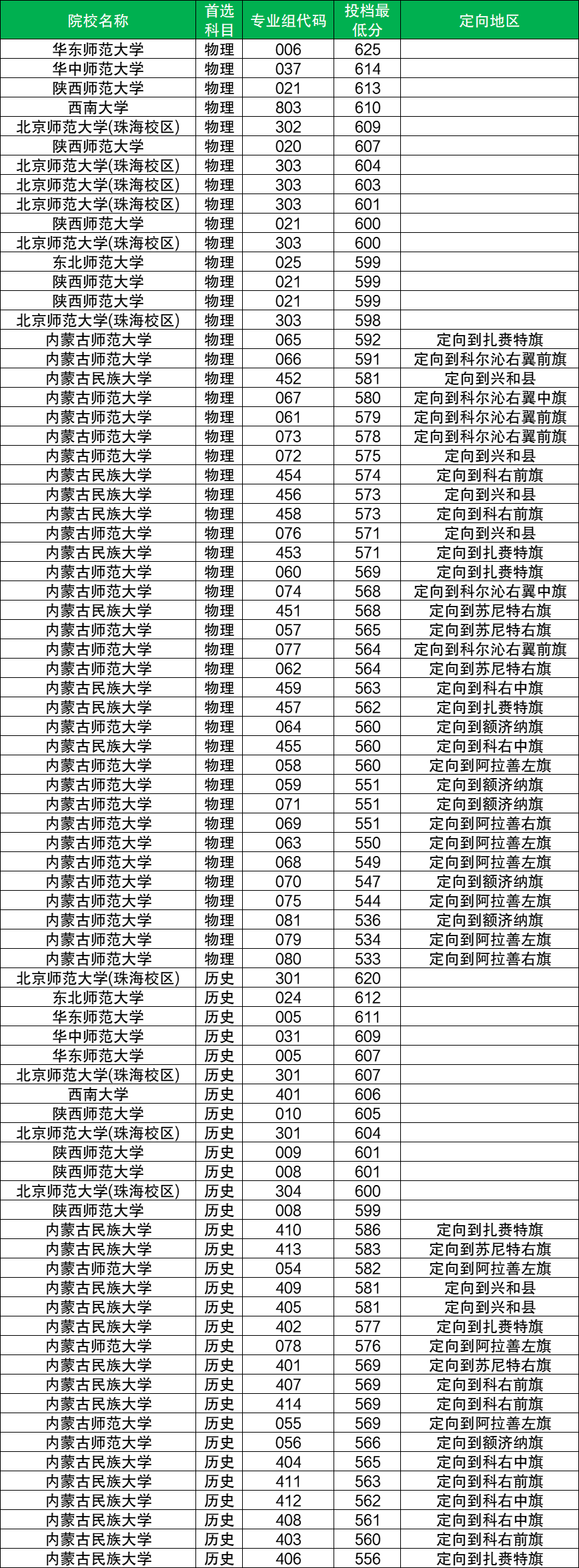 篇幅有限,下面是2025年内蒙古优师专项计划院校录取分数线一览表(需滑动查阅):