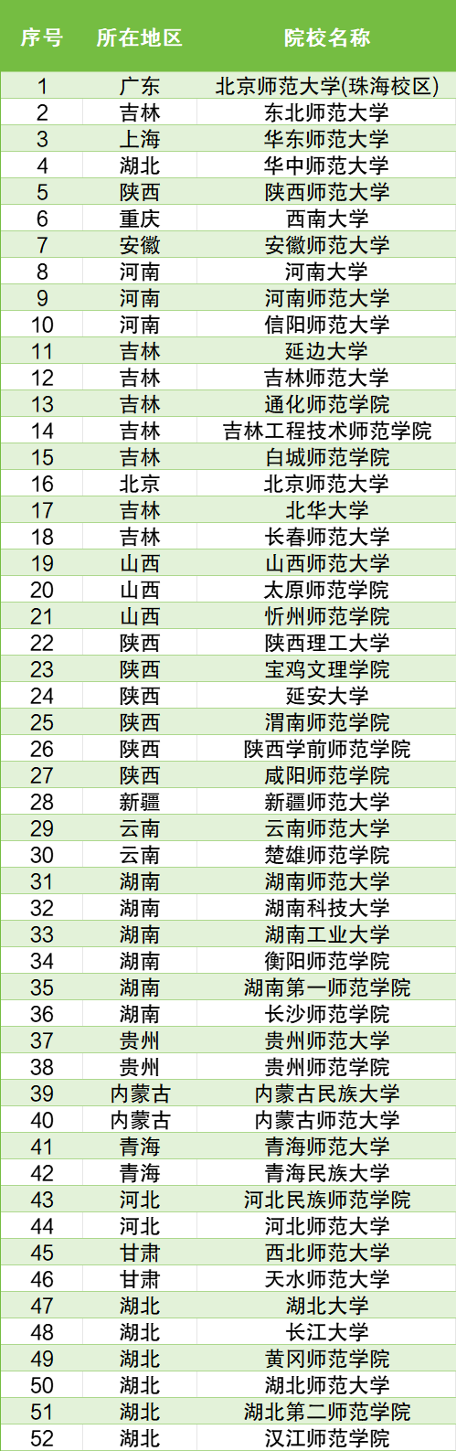 华中地区:河南师范大学、湖北师范大学、湖南师范大学