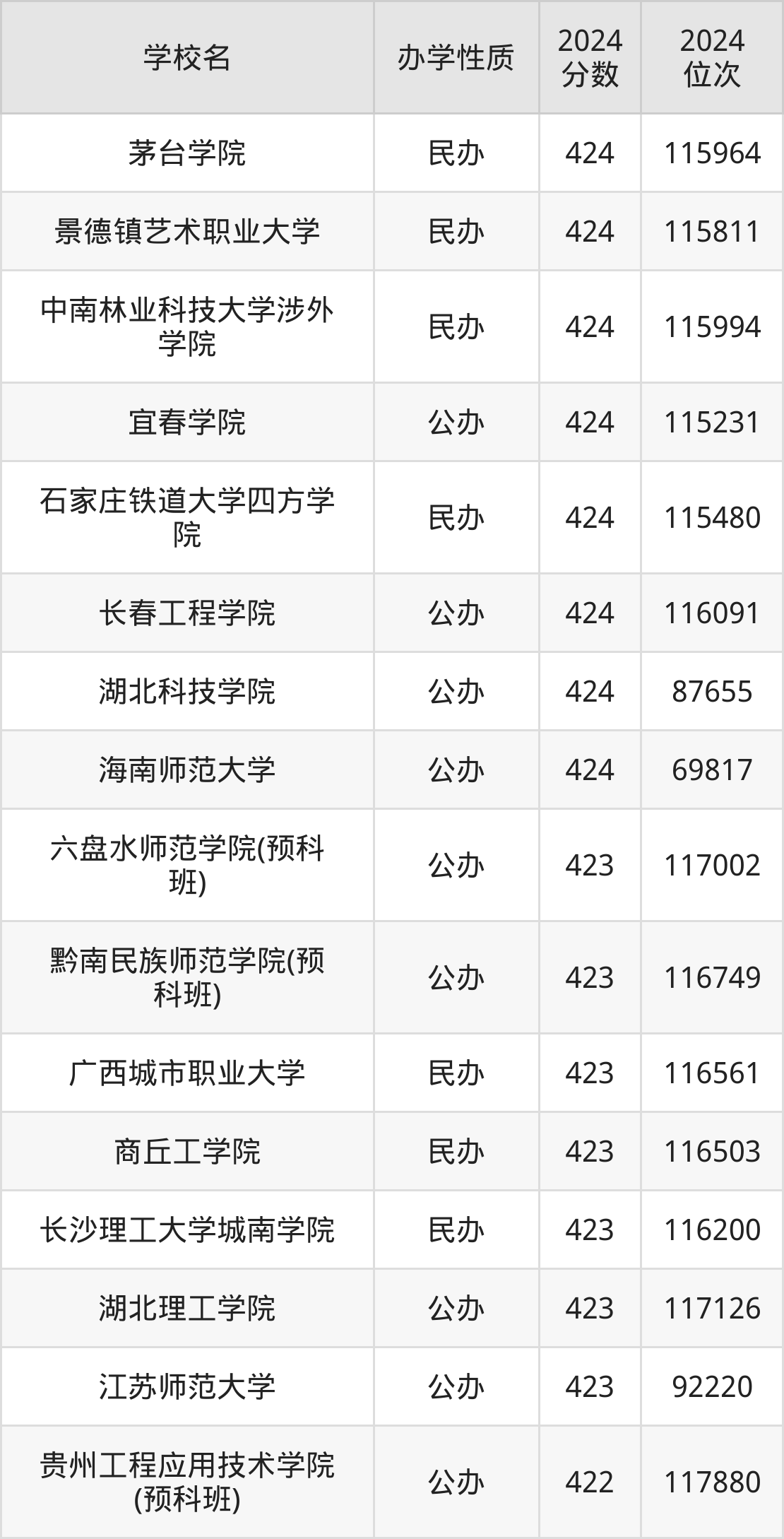 2024年贵州物理组本科线是380分,线上43分,即423分。本文筛选422分到424分之间的大学名单汇总。